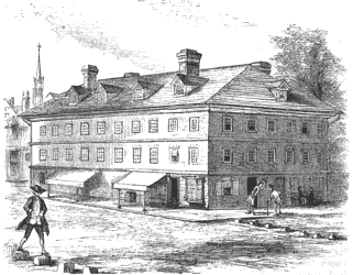 The “Henry Fite House”, located on West Baltimore Street (then known as Market Street), between South Sharp and North Liberty Streets (also later known as Hopkins Place), in Baltimore, Maryland, was the meeting site of the Second Continental Congress from December 20, 1776 until February 22, 1777.[1] Built as an inn and tavern around 1770 in the Georgian architectural style in red brick with white wood trim by Henry Fite (1722–1789), the building became known as “Congress Hall” when it briefly served as the new nation’s seat of government in 1776–77. Later, following the Revolutionary War, it became known locally as “Old Congress Hall”. The structure was destroyed during the February 7–8, 1904 Great Baltimore Fire, which started nearby.[2]