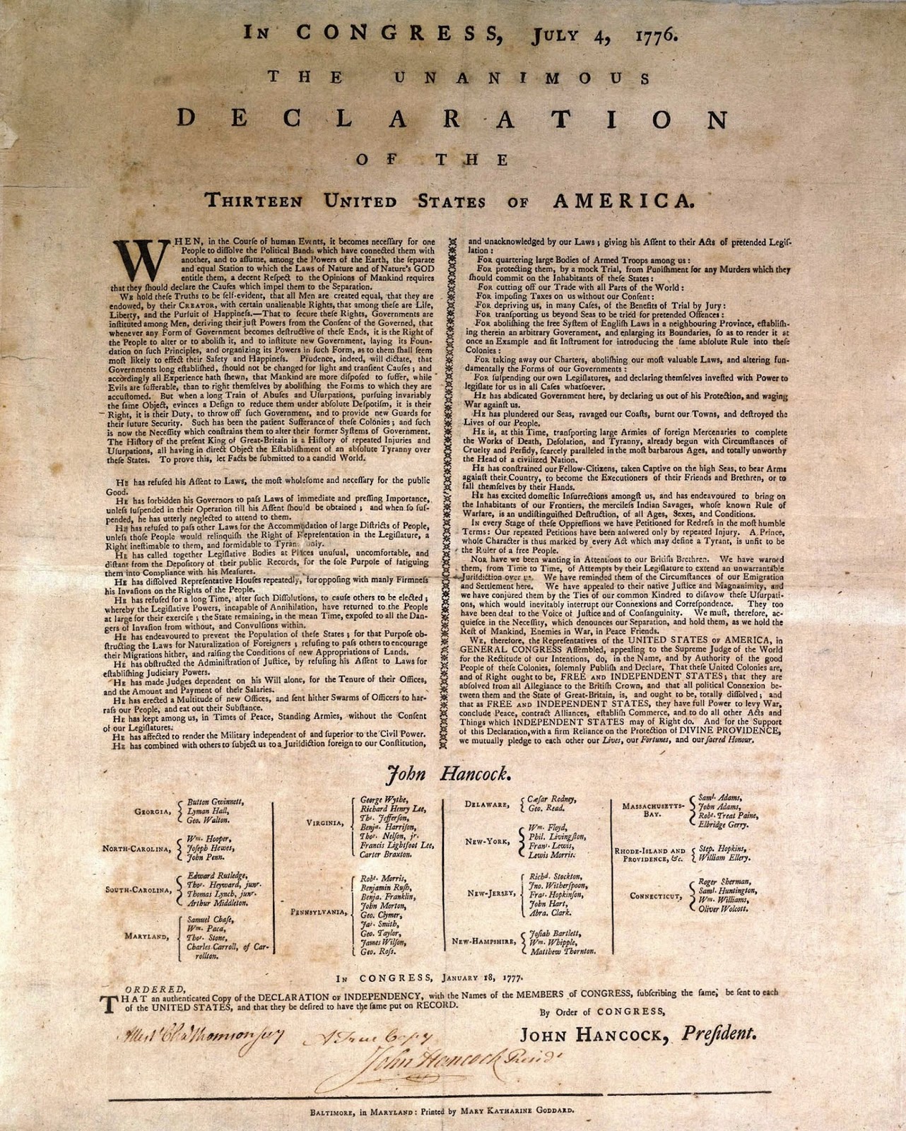 Delaware • George Read • Caesar Rodney • Thomas McKean [not present on Goddard Broadside] Pennsylvania • George Clymer • Benjamin Franklin • Robert Morris • John Morton • Benjamin Rush • George Ross • James Smith • James Wilson • George Taylor Massachusetts • John Adams • Samuel Adams • John Hancock • Robert Treat Paine • Elbridge Gerry New Hampshire • Josiah Bartlett • William Whipple • Matthew Thornton Rhode Island • Stephen Hopkins • William Ellery New York • Lewis Morris • Philip Livingston • Francis Lewis • William Floyd Georgia • Button Gwinnett • Lyman Hall • George Walton Virginia • RichardHenry Lee • Francis Lightfoot Lee • Carter Braxton • Benjamin Harrison • ThomasJefferson • George Wythe • Thomas Nelson, Jr. North Carolina • William Hooper • John Penn • Joseph Hewes South Carolina • Edward Rutledge • Arthur Middleton • Thomas Lynch, Jr. • Thomas Heyward, Jr. New Jersey • Abraham Clark • John Hart • Francis Hopkinson • Richard Stockton • John Witherspoon Connecticut • Samuel Huntington • Roger Sherman • William Williams • Oliver Wolcott Maryland • Charles Carroll • Samuel Chase • Thomas Stone • William Paca,