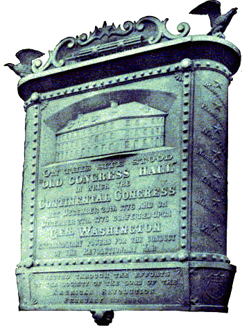 On February 22, 1894, the Sons of the American Revolution placed a large, elaborate, polished bronze memorial tablet in front of the “Henry Fite House.” The plaque described the building’s two month service to the nation proclaiming: “On this site stood Old Congress Hall, in which the Continental Congress met”. Above the plate containing the picture and inscription, is an ornamental cornice, with an eagle with outstretched wings on each corner, and a supported scroll-work, surmounted by a star in the center. The sides of the tablets are rounded. On one of these rounded sides are the names of seven of the original thirteen states — Maryland, Pennsylvania, Massachusetts, Delaware, New York, Rhode Island and Connecticut — with a star between each; and on the other side the names of the other six: New Hampshire, New Jersey, Virginia, North Carolina, South Carolina and Georgia. Shields decorate the lower corner
