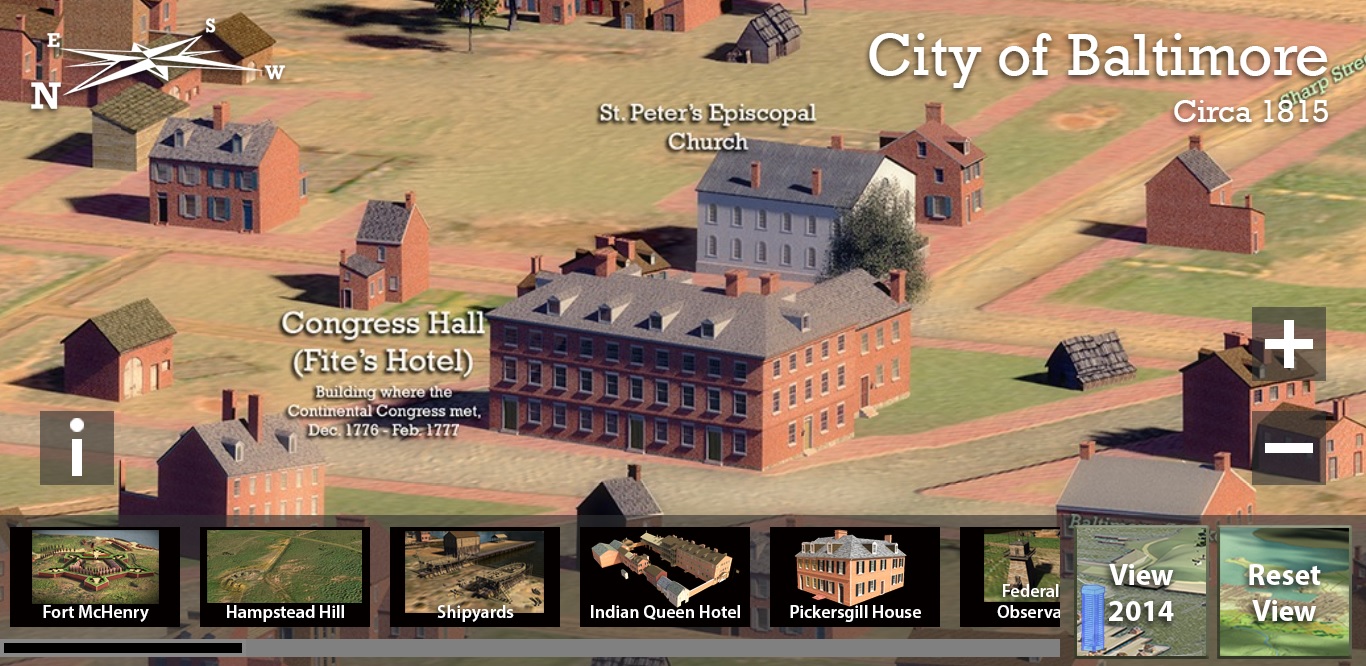 As we can see from this 19th-century photograph of St. Peter’s, the BEARINGS group did a remarkable job of creating an accurate version of the building, based on the descriptive materials (i.e. photographs) that it had at its disposal. Well done. The truly astounding part about seeing St. Peter’s visualized on a 3-D map, however, is noticing just how close it was to the Henry Fite House, a.k.a. “Congress Hall,” where Continental Congress met from December 20th 1776 through February 27th 1777, when Baltimore Town was the Capital of the fledgling United States of America and the Fite House was its capitol. An all-too-unknown fact, if you ask me—and one that puts Baltimore in some rather exclusive company.