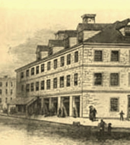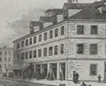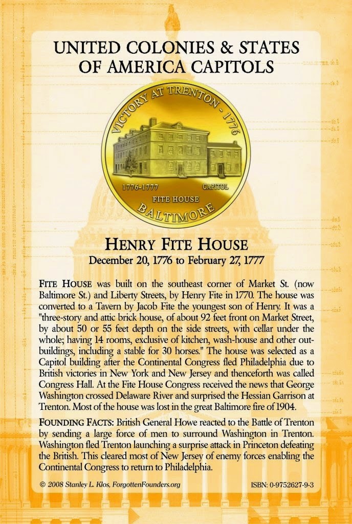 The Second Continental Congress moved from Philadelphia to Baltimore in the winter of 1776 to avoid capture by British forces, who were advancing on Philadelphia, the new American capital city, during the New York and New Jersey campaign. As the largest building then in forty-seven-year-old Baltimore Town, Henry Fite’s six year old tavern provided a comfortable location of sufficient size for the Congress to meet; its site at the western edge of town was beyond easy reach of the British Royal Navy‘s ships and artillery should they try to sail up the Harbor and the Patapsco River to shell the town. A visitor described the tavern as a “three-story and attic brick house, of about 92 feet front on Market Street, by about 50 or 55 feet depth on the side streets, with cellar under the whole; having 14 rooms, exclusive of kitchen, wash-house and other out-buildings, including a stable for 30 horses.”[2][3]